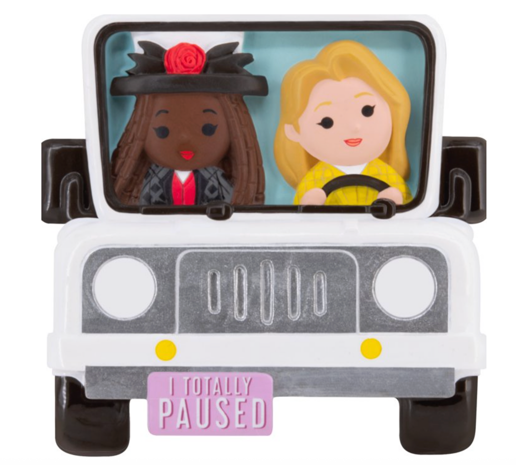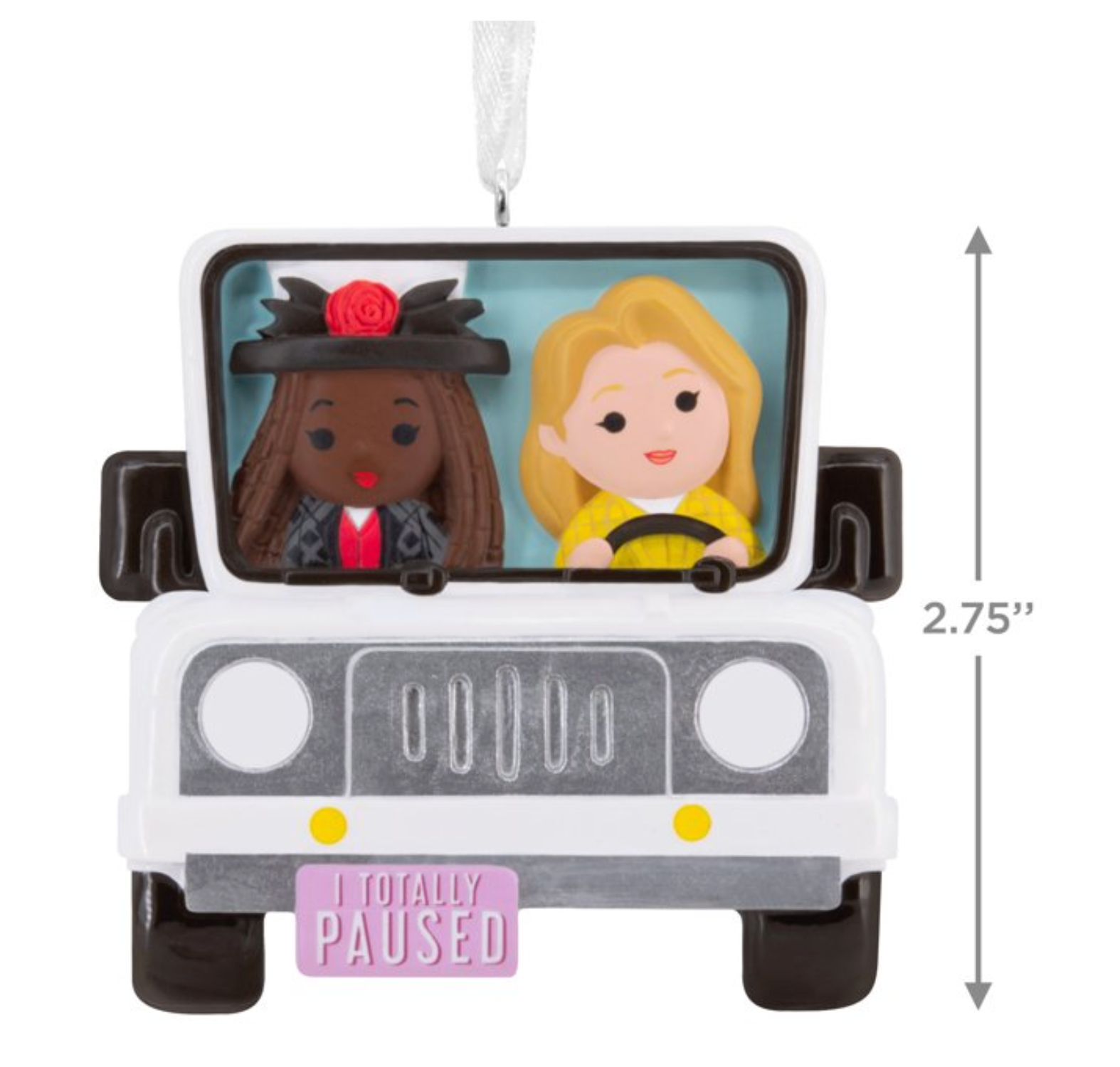 Cruise down memory lane with this Hallmark Christmas ornament from the '90s hit movie "Clueless." Stylized design features Cher and Dionne riding in a white Jeep Wrangler.