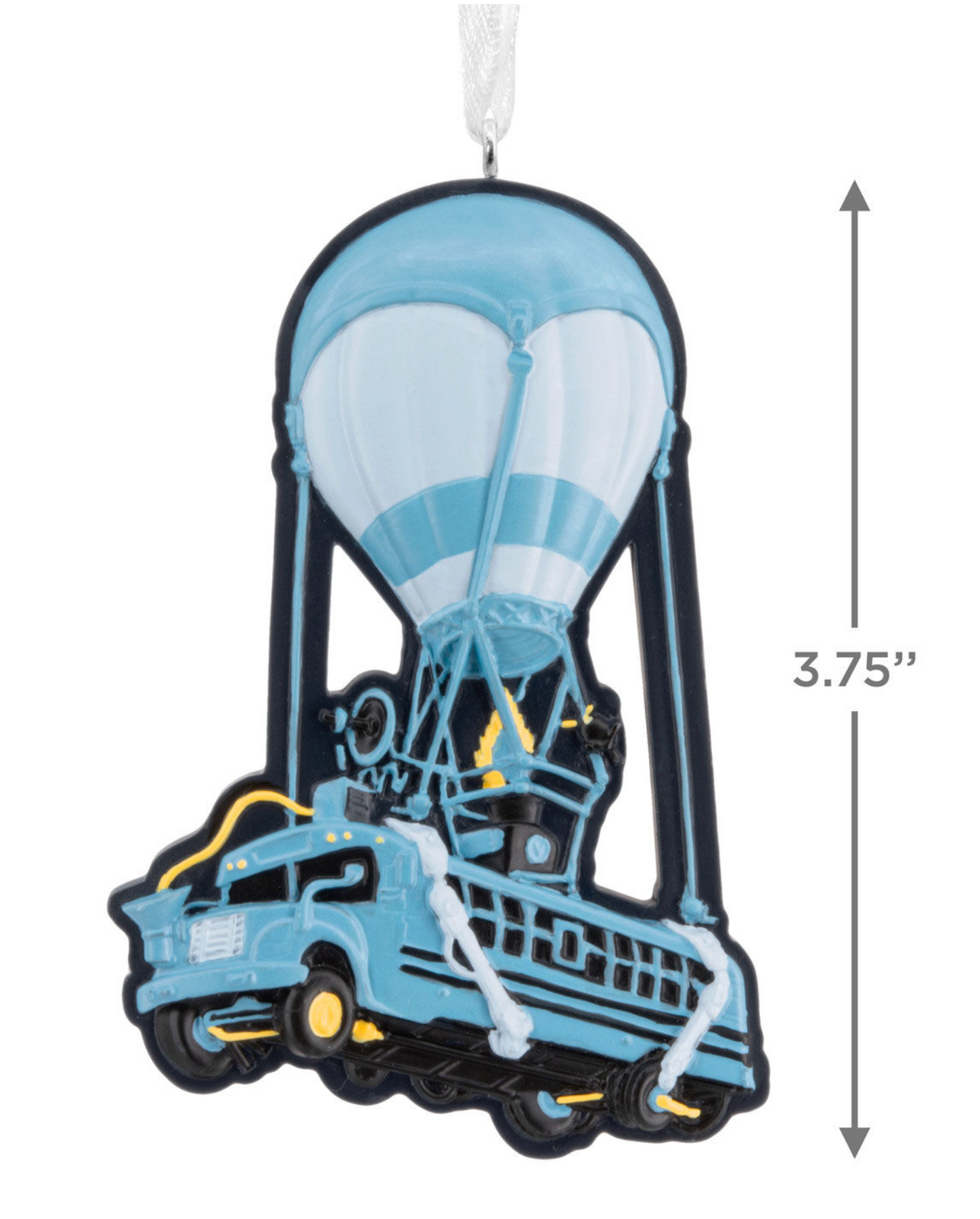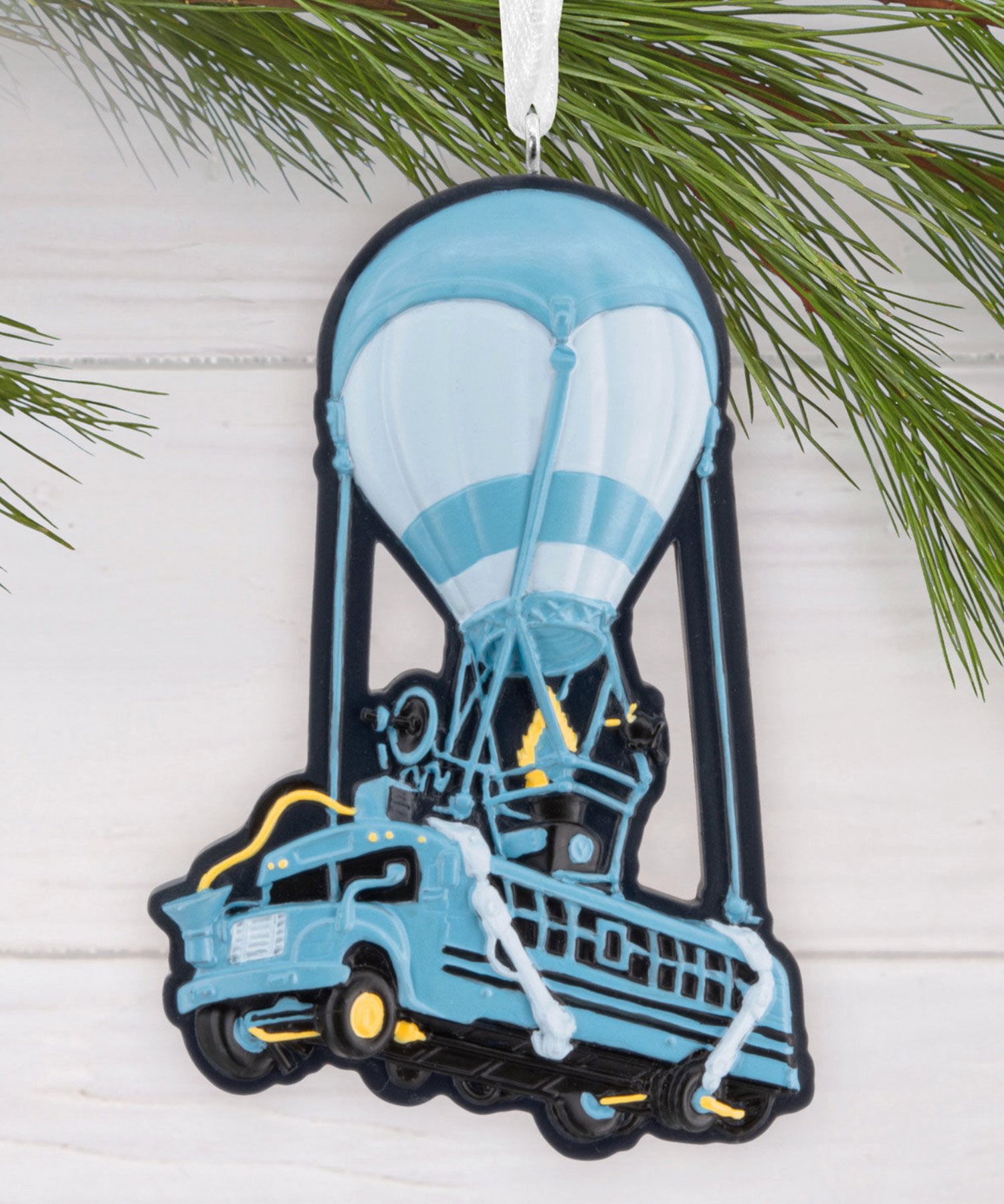 Drop in and bring the world of Fortnite to life in your seasonal decor. Holiday excitement soars to new heights with this Christmas tree ornament featuring the Battle Bus, the hot air balloon-powered blue bus from the video game phenomenon "Fortnite Battle Royale."