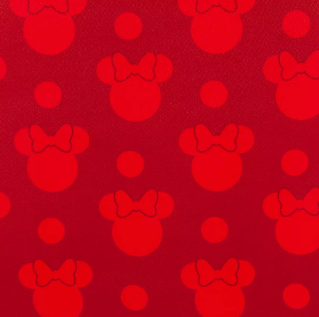 Lining features allover red Minnie icons and polka dot design
