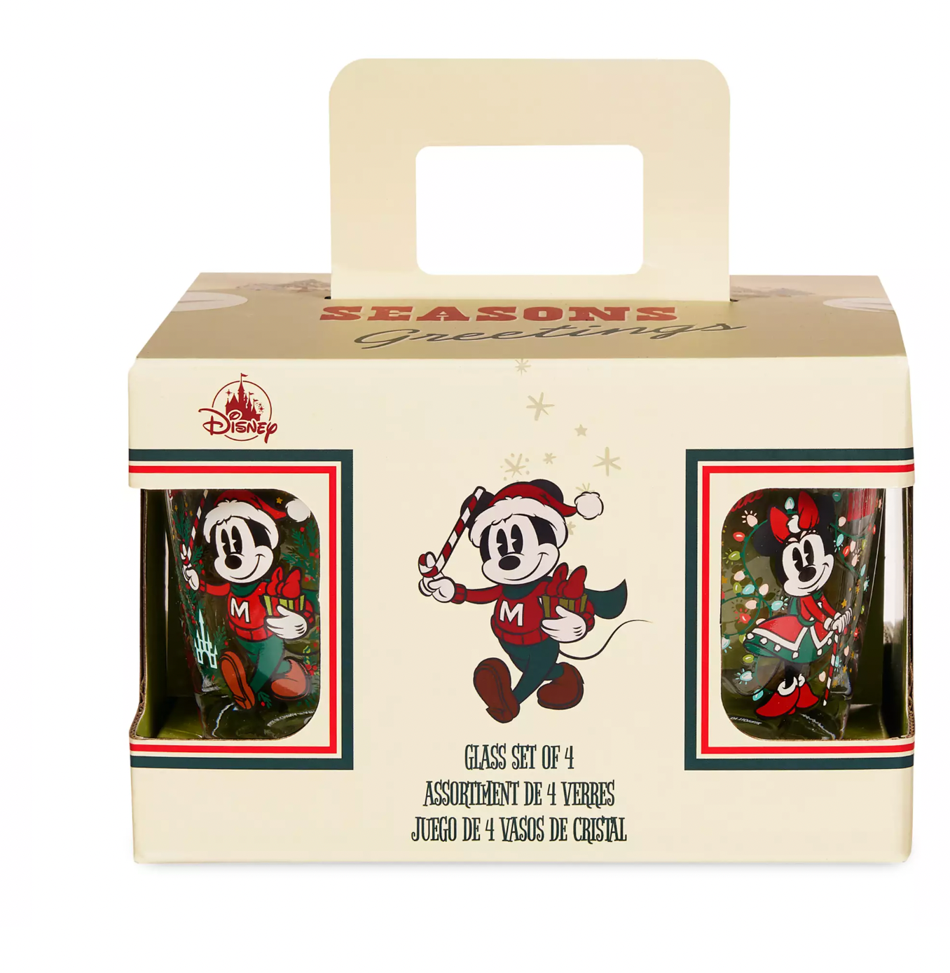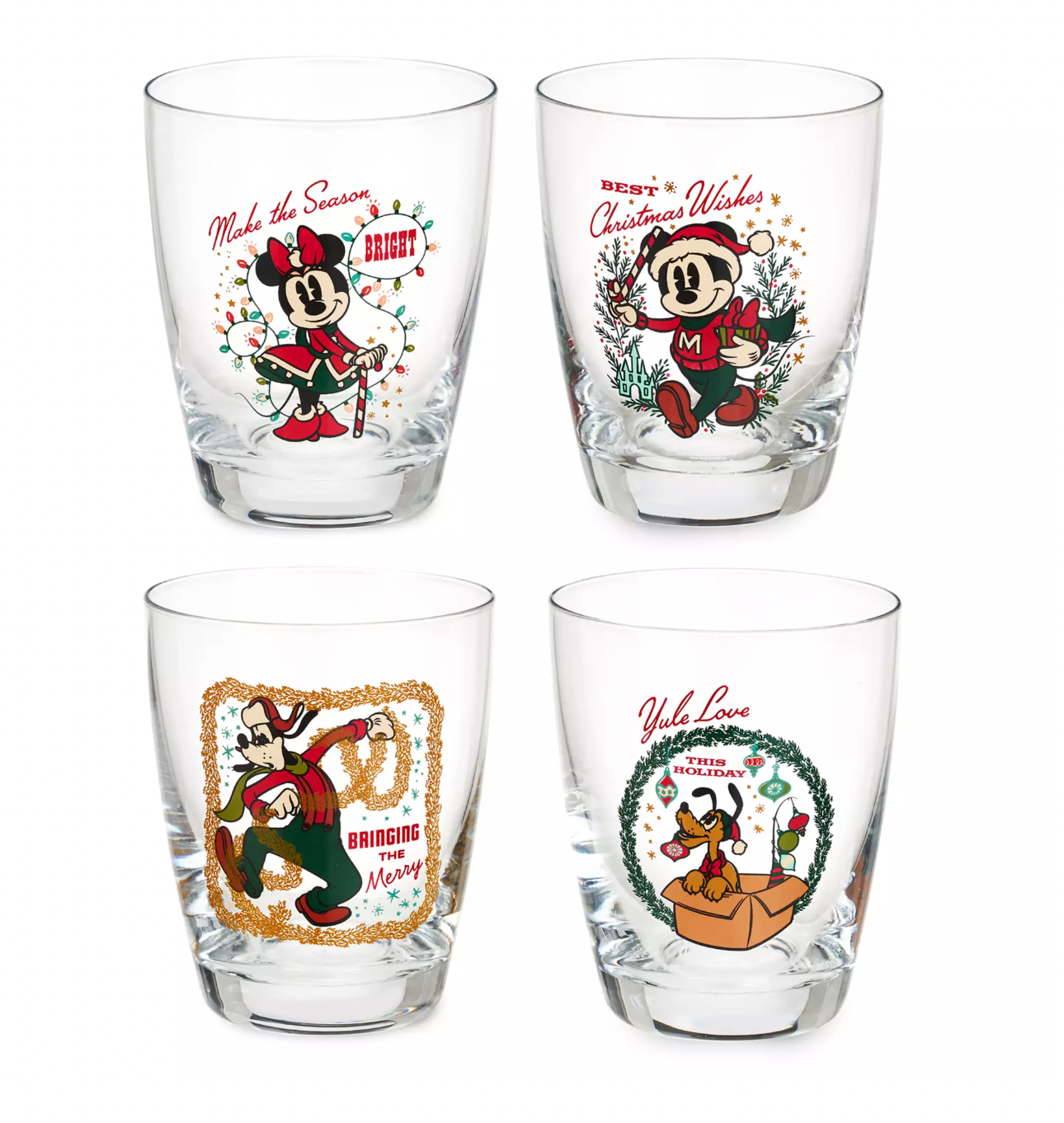 Each glass includes Holiday-themed artwork of Mickey, Minnie, Pluto, or Goofy