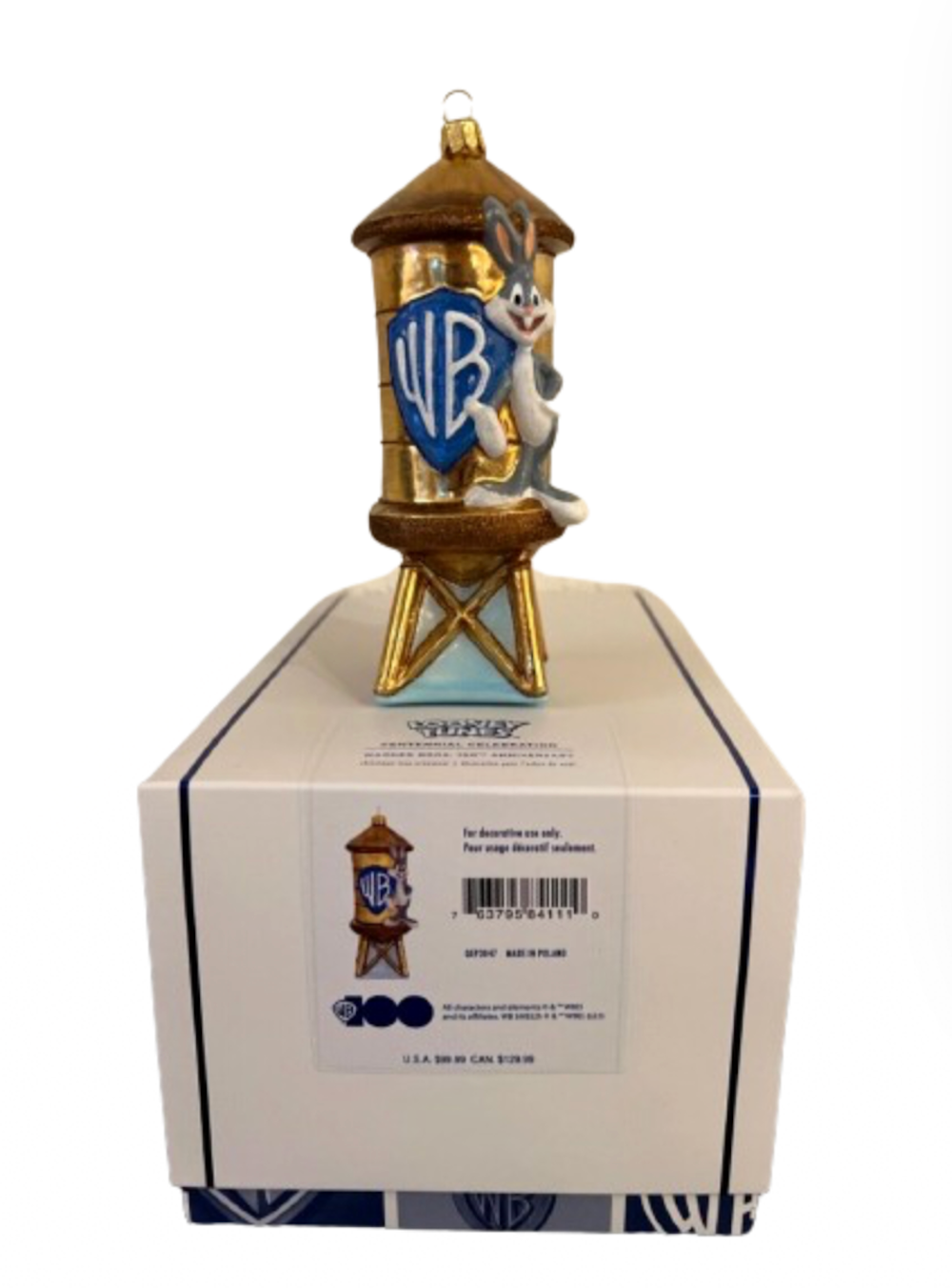 Limited-quantity, hand-blown glass ornament made in Poland celebrates 100 legendary years of entertainment from Warner Bros. Studios.