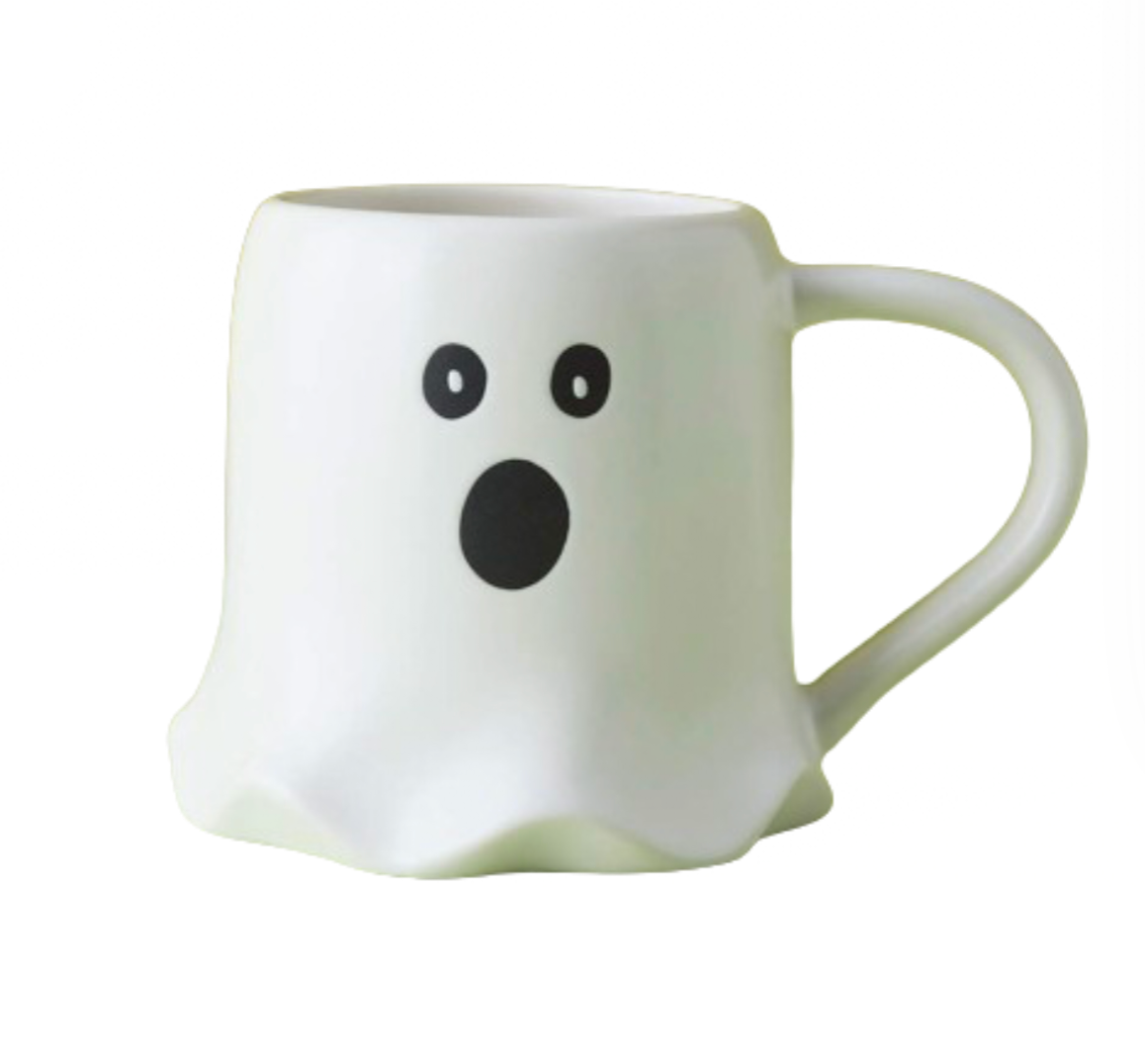 Ceramic sculpted ghost mug features an adorably spooky face, a ruffly bottom edge and a fun message on the interior.