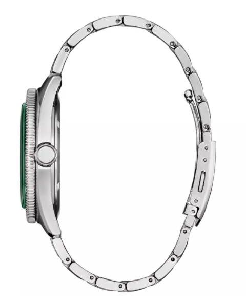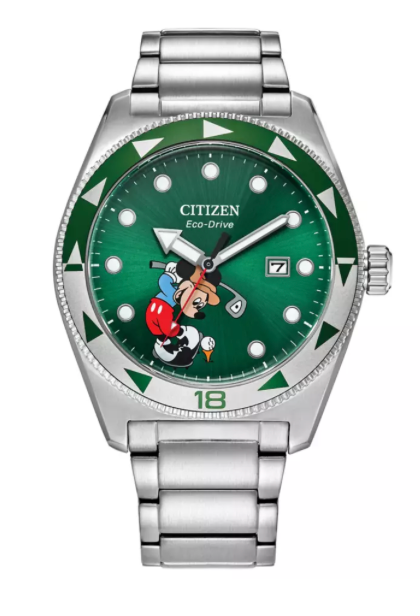 Golfer Mickey Mouse takes a swing at sporty fashion with this stainless steel watch by Citizen. The colorful dial will make you feel like you're relaxing on the greens no matter where you're keeping time. The markers resemble golf balls to continue the theme. And Eco-Drive light conversion technology means you never need a battery. This watch is a ''whole in one''!
