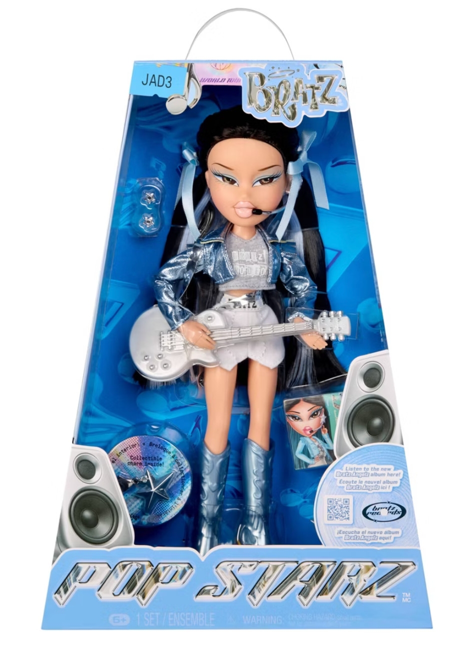 WHATZ' INCLUDED: 1 Bratz® Pop Starz Doll, 1 jacket, 1 shirt, 1 skirt, 1 pair of boots, 2 bows, 1 guitar, 1 headset microphone, 1 pair of earrings, 1 charm, 1 hairbrush, 1 album