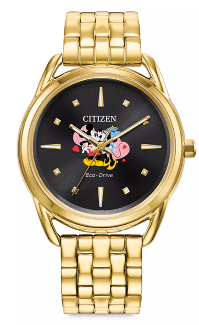 Mickey and Minnie always enjoy their time together so it's fitting they are paired on this Sweetheart Nights Watch by Citizen. The couple is pictured along with hearts on the black dial of this stainless steel watch and bracelet with its goldtone finish. This gorgeous timepiece is the embodiment of glamour and romance. Featuring three-hand movement and EcoDrive technology, it marries the charm of Mickey and Minnie with the emotional expression of love for a statement accessory that is truly timeless.