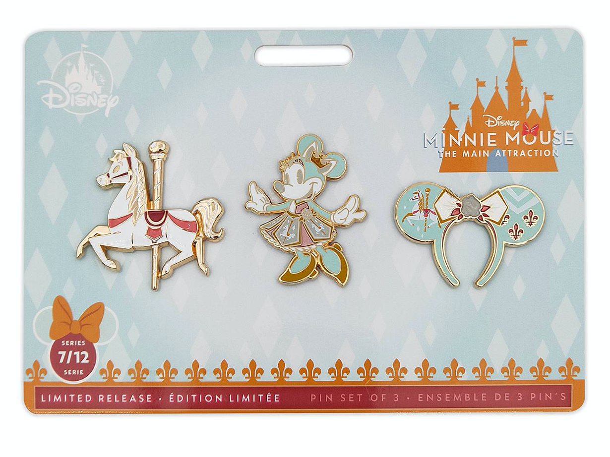 Set of three pins inspired by King Arthur Carrousel, includes Minnie (in themed costume), Carrousel Horse, and ear headband