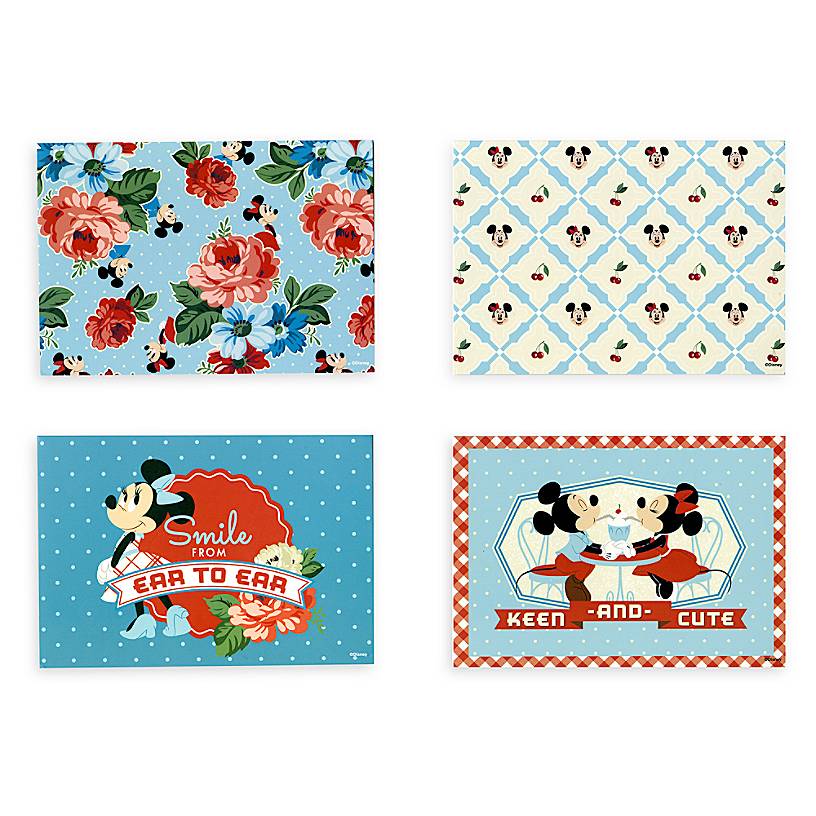 Four designs (three cards of each): Minnie with ''Smile from ear to ear''; Mickey and Minnie with ''Keen and cute''; Mickey, Minnie and flower pattern; Mickey, Minnie and cherry pattern