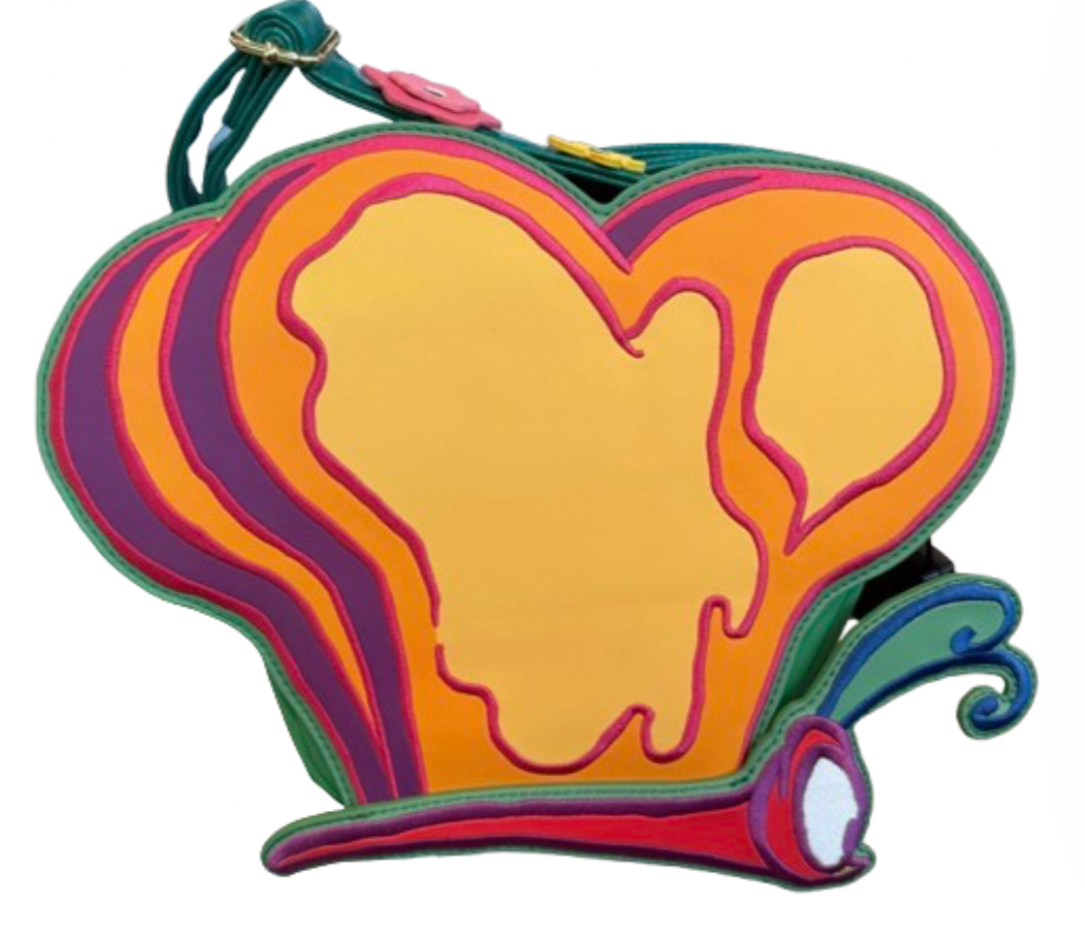 This Loungfly purse features a large applique on the front shaped like the whimsical bread-and-butterfly insect from the Disney animated film "Alice in Wonderland." Its wings are shaped like pieces of bread with butter on them. Its body is pink and it has large eyes and blue antennae.