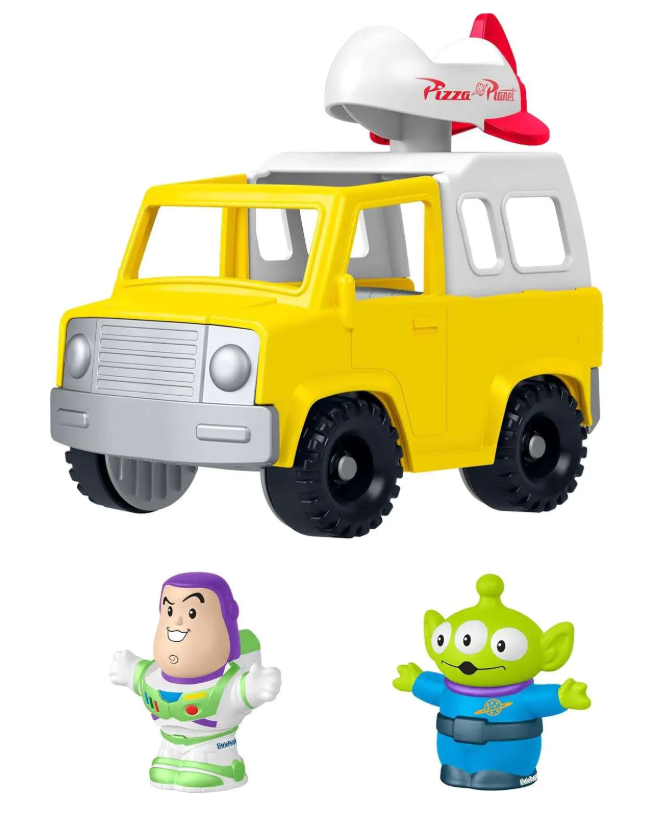 Young Pixar fans can imagine their own action-packed adventures with this Little People Toy Story Pizza Planet Truck set from Fisher-Price. Inspired by the Disney and Pixar Toy Story films, this push-along toy vehicle is styled like the Pizza Planet restaurant delivery truck and features a spaceship on the roof that kids can spin all around. This toddler-friendly set includes 2 Little People figures styled like Buzz Lightyear and a Toy Story Alien, which kids can place inside the truck to drive the storytelling fun!